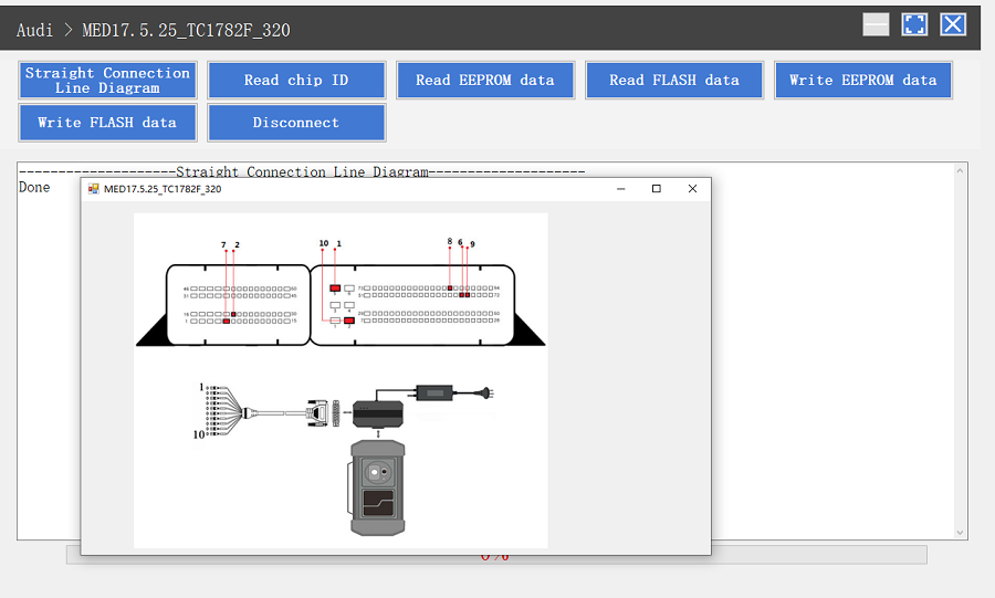 3. Connection: Connect the ECU and PCBOX according to the information provided in the connection diagram. The physical connection diagram of MED17.5.25 (using the BENCH mode line) is shown in Figure 5, and the physical connection diagram using the gearbox adapter is shown in Figure 6.